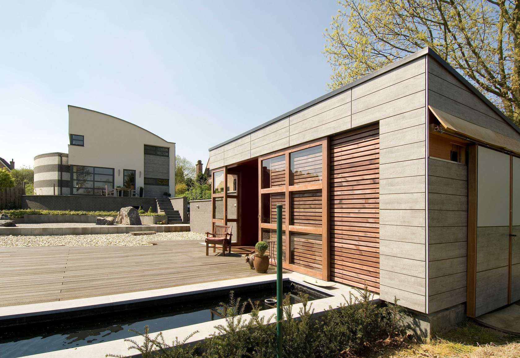Rockpanel cladding is made from compressed stone wool. It offers fire resistance, durability, and flexibility in design.
