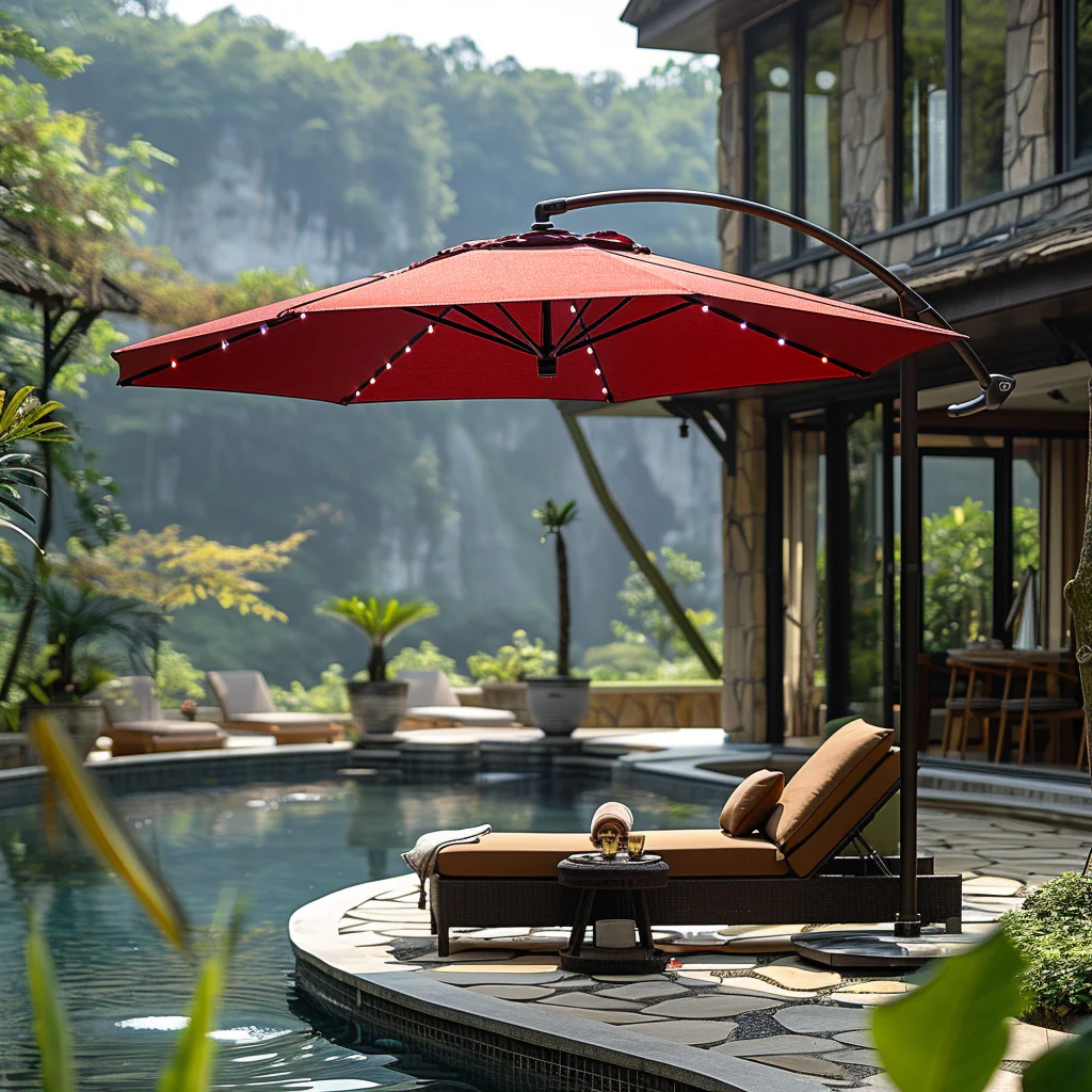 This umbrella design provides shade without a center pole, allowing flexible seating arrangements. It is ideal for dining and lounge areas.
